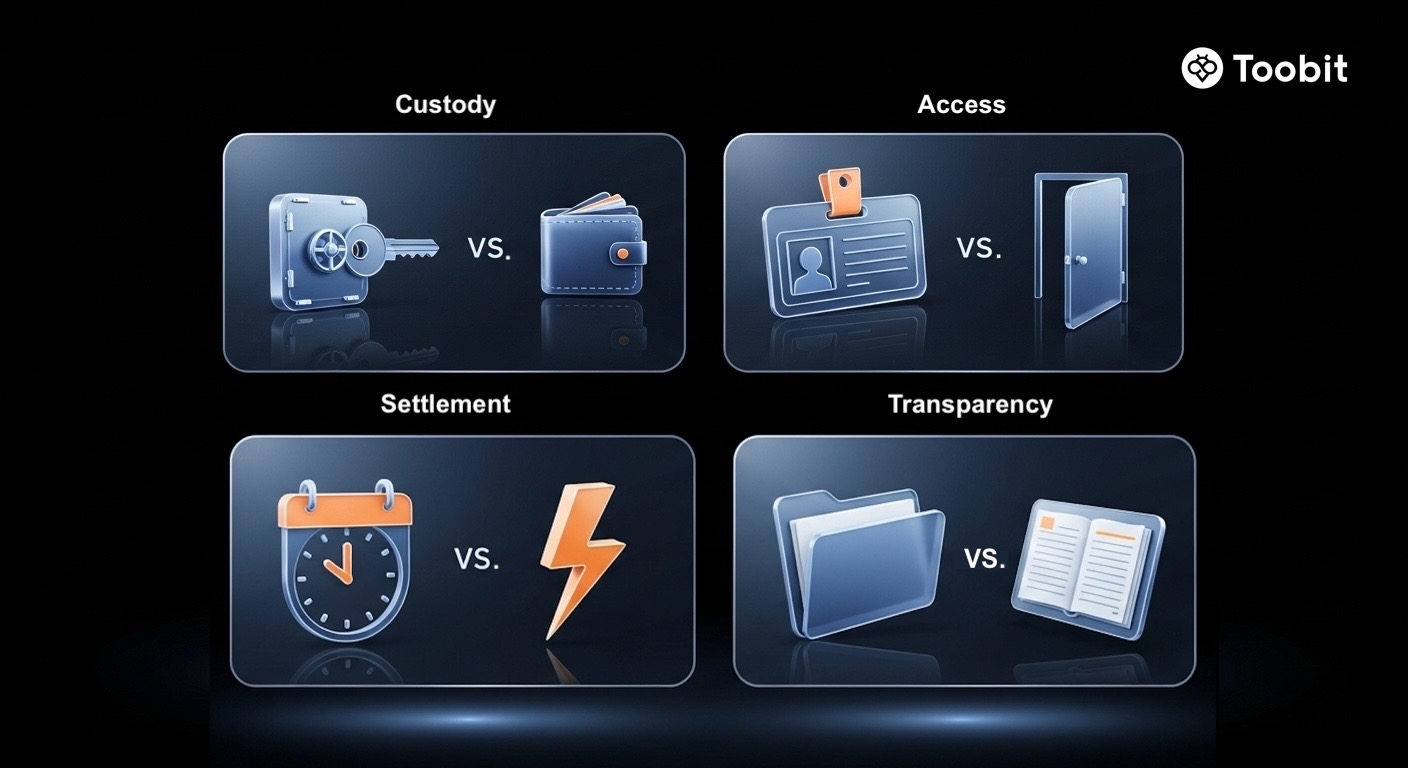 TradFi بر نهادهای مالی و زیرساختهای قانونگذاریشده متکی است. DeFi بر کیفپولها و قراردادهای هوشمند استوار است و بهصورت همیشگی فعال است. منبع: Toobit