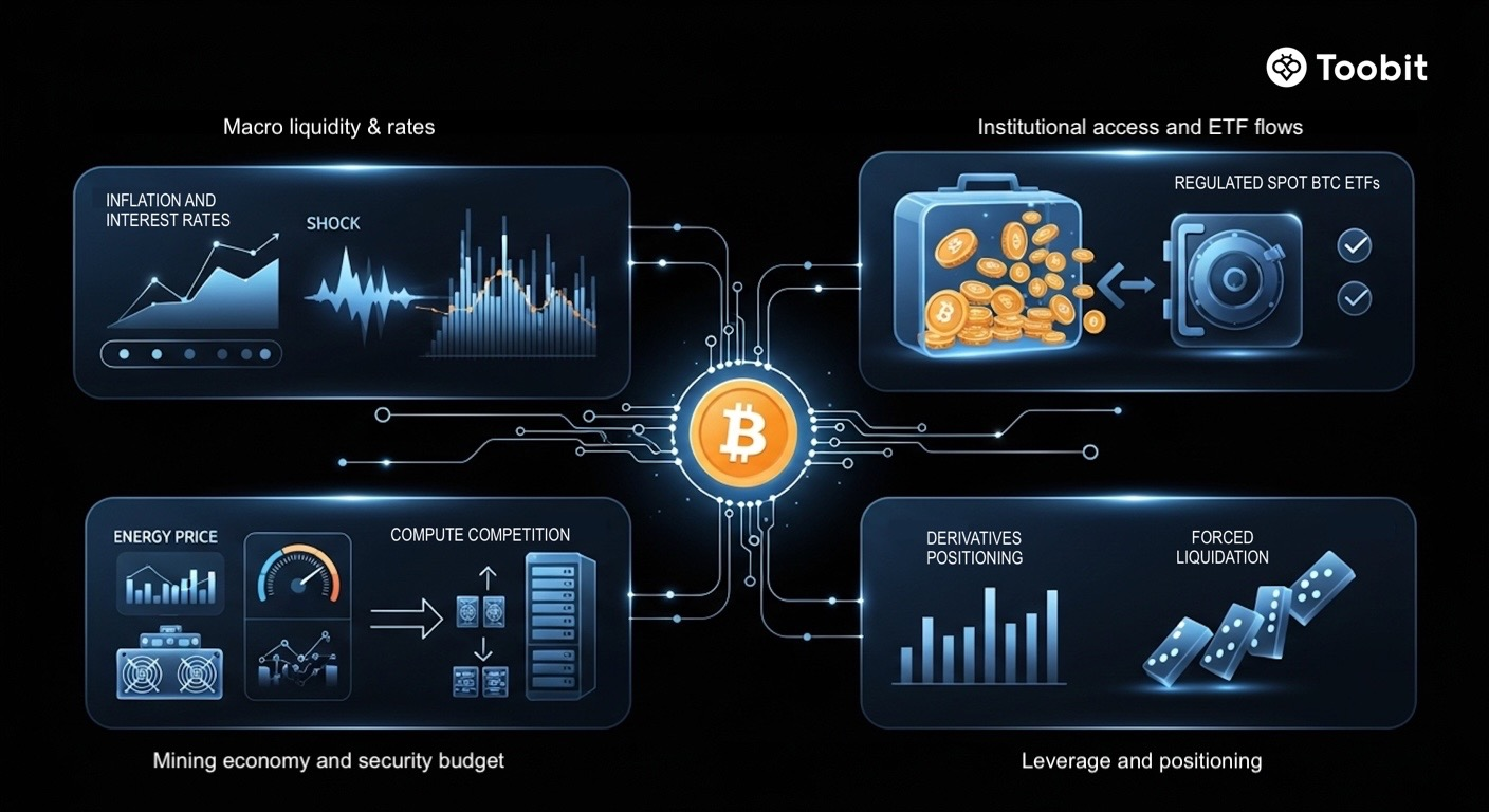 مهمترین کاتالیزورها: نقدینگی کلان اقتصادی و انتظارات مربوط به نرخ بهره، جریان سرمایه نهادی، اقتصاد استخراج و همچنین اهرمهای معاملاتی که میتوانند نوسانات قیمت را در هر دو جهت تشدید کنند.