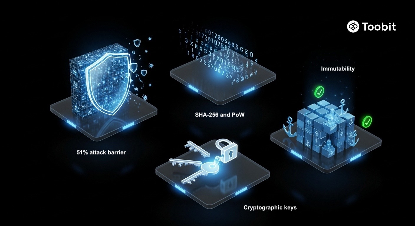 ساختار امنیتی بیتکوین شامل هزینه اقتصادی اثبات کار، الگوریتم هش SHA-256، مدیریت قدرتمند کلیدهای رمزنگاری و عمق تأیید تراکنشهاست که بازنویسی تاریخچه را دشوار میسازد.