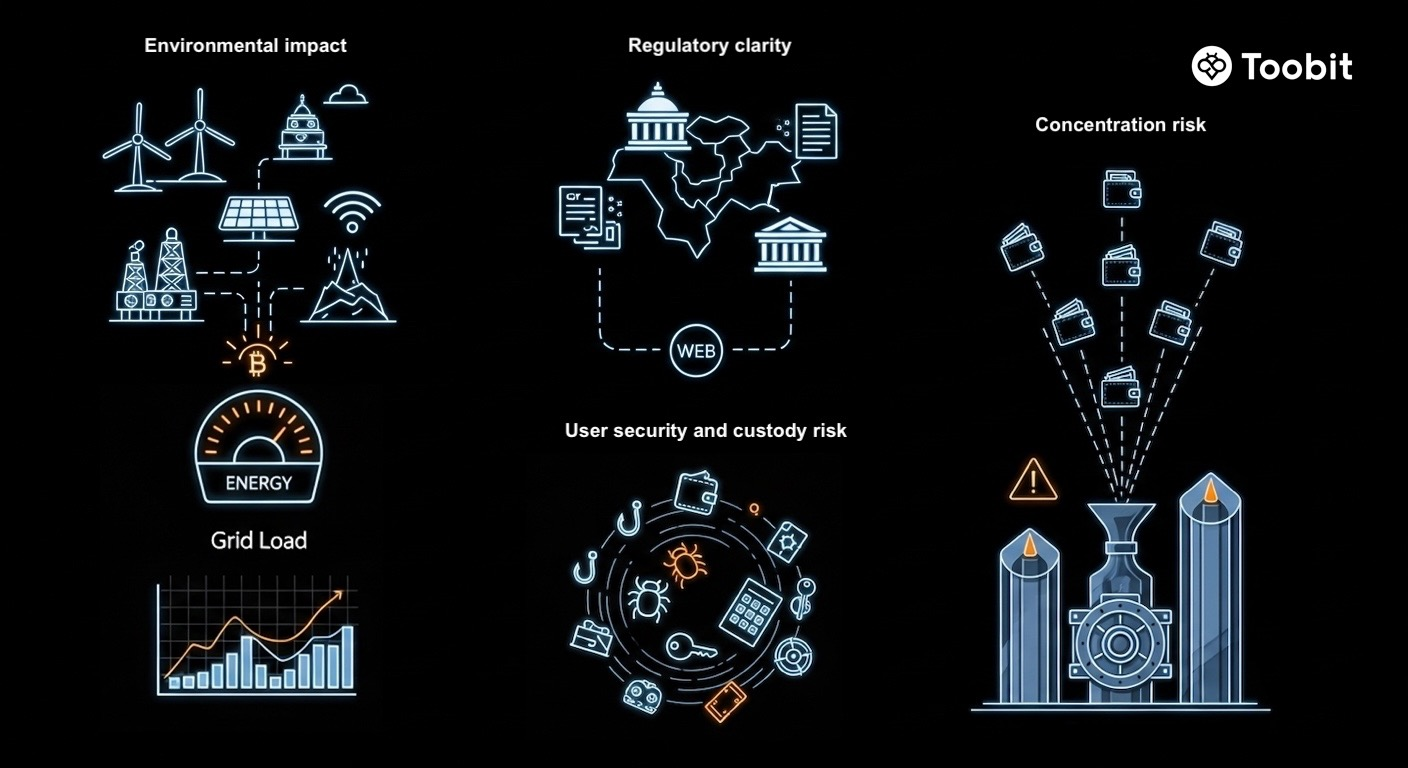 محورهای اصلی فشار: ملاحظات مربوط به مصرف انرژی، تحول چارچوبهای مقرراتی، تمرکز در ساختارهای حضانت و ریسکهای انسانی در حوزه امنیت، از جمله فیشینگ، بدافزار و مدیریت نادرست کلیدهای خصوصی.