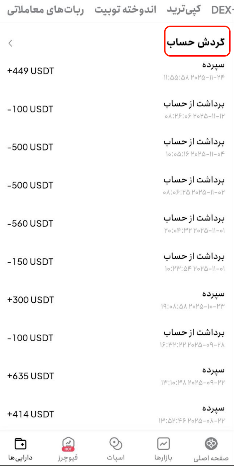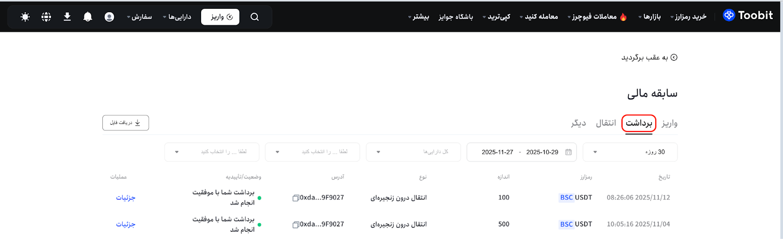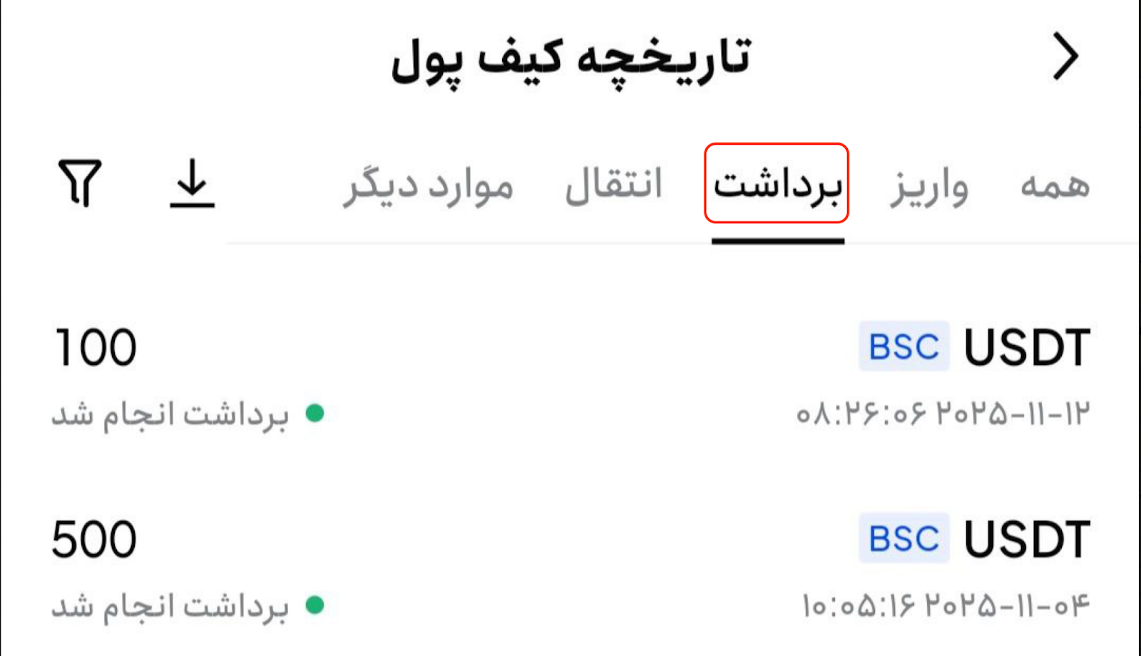 در صفحه [تاریخچه کیف پول]، قسمت [برداشت] را انتخاب کنید.