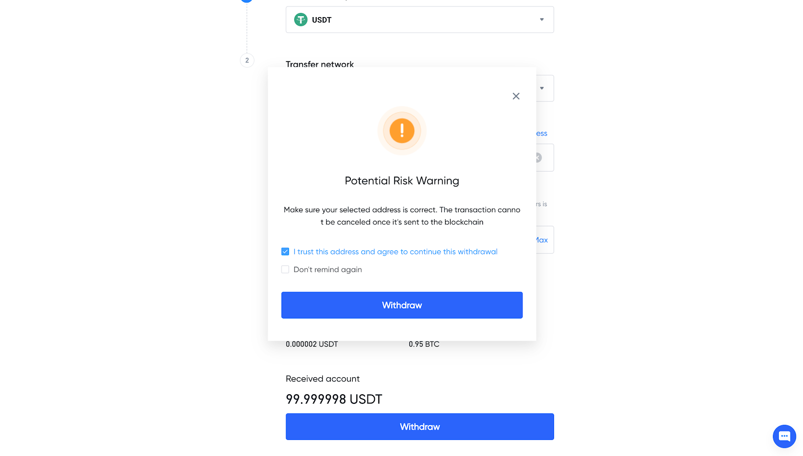 نکته مهم: در مورد کوینهایی مانند USDT که از چندین بلاکچین پشتیبانی میکنند (OMNI، ERC20)، لطفاً قبل از وارد کردن آدرس واریز، بلاکچین مناسب را انتخاب کنید. در صورتی که USDT شما از شبکه اتریوم باشد با آدرس USDT-ERC20 سازگار است. در حالی که، کوینهای USDT شما از لایه Omni فقط با آدرس USDT-Omni سازگار خواهند بود. ارسال USDT شما به یک آدرس ناسازگار ممکن است منجر به از دست رفتن سرمایه برداشتشده شود. لطفاً برای اطمینان از اینکه برداشت شما از کدام شبکه منتقل میشود، کیف پول/صرافی مقصد خود را بررسی کنید و آدرس واریز مناسب را که در کیف پول/صرافی مقصد پیدا کردهاید، در صفحه برداشت خود در TooBit کپی کنید.