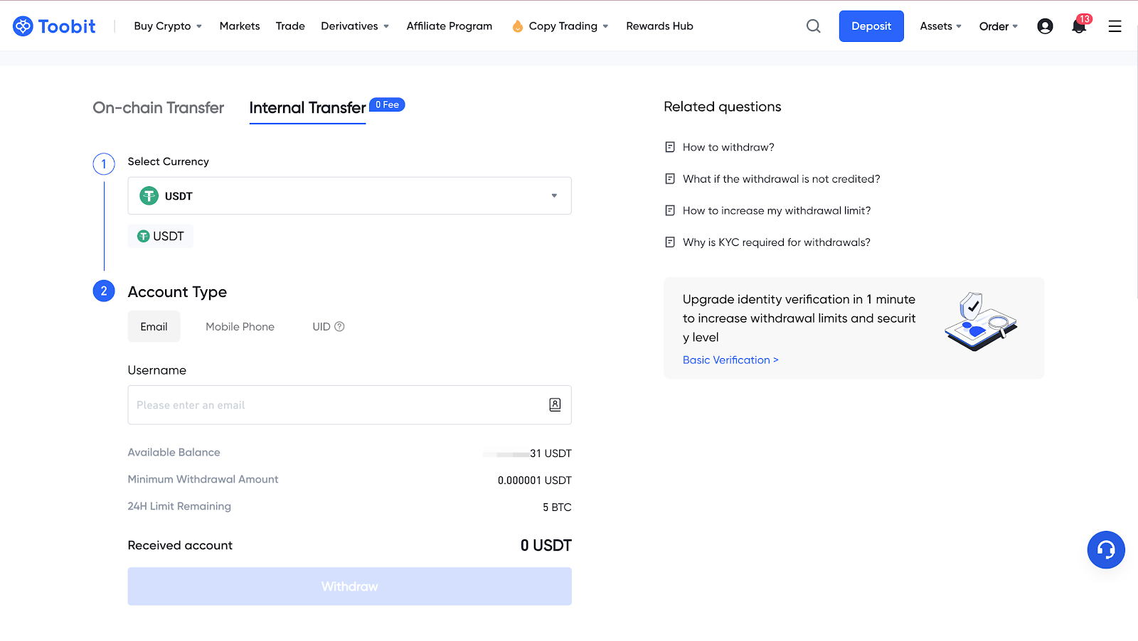 - انتقالات داخلی برای انتقال سریع و آسان سرمایه بین حسابهای Toobit در نظر گرفته شدهاند. این روش برای تراکنشهای فوری که بدون دخالت بلاکچین انجام میشوند، عالی است.