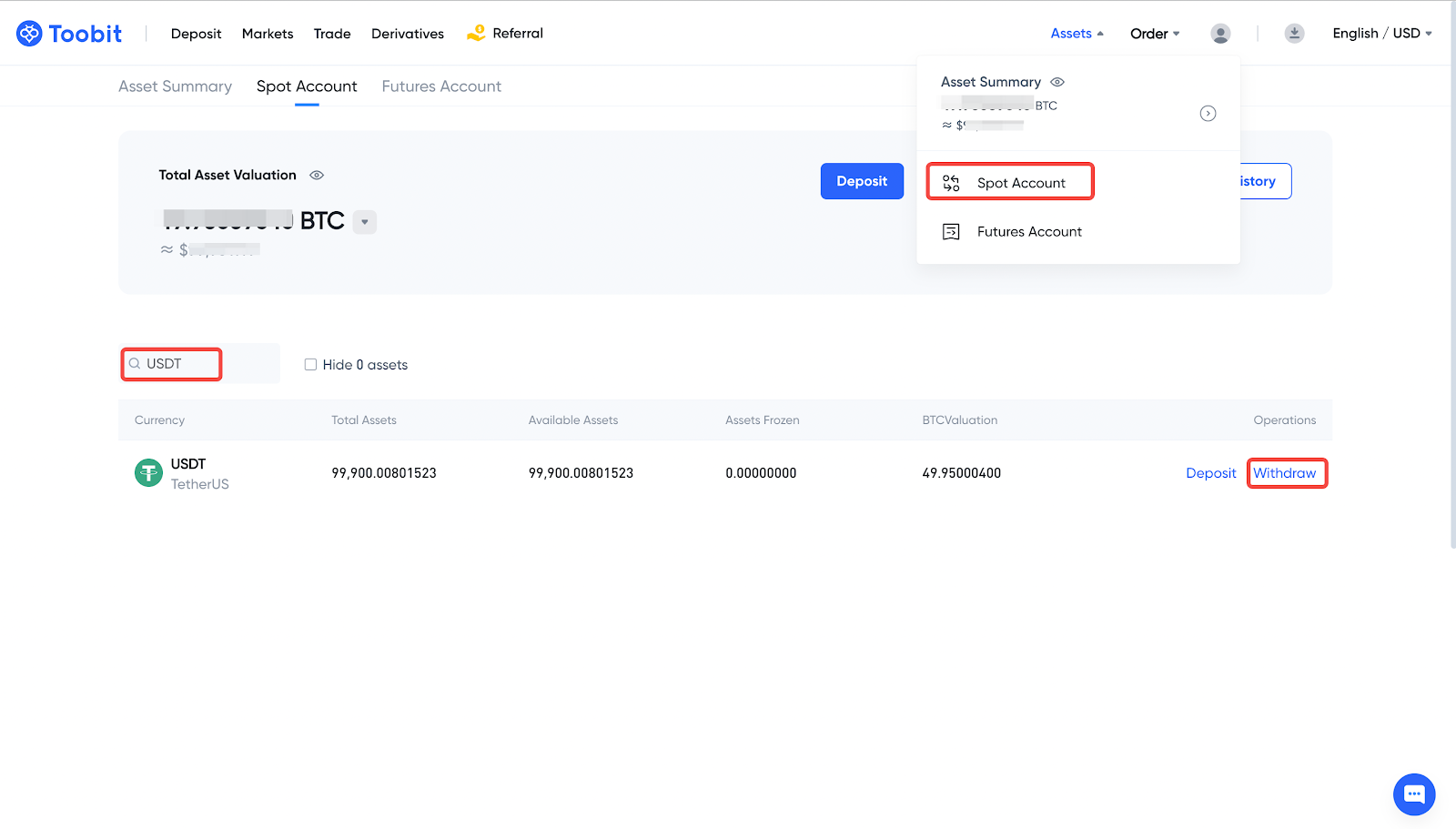 2. روی «داراییها» کلیک کنید و ارز مورد نظر برای برداشت را انتخاب نمایید. به عنوان مثال «USDT» را انتخاب کرده و روی «برداشت» کلیک کنید.