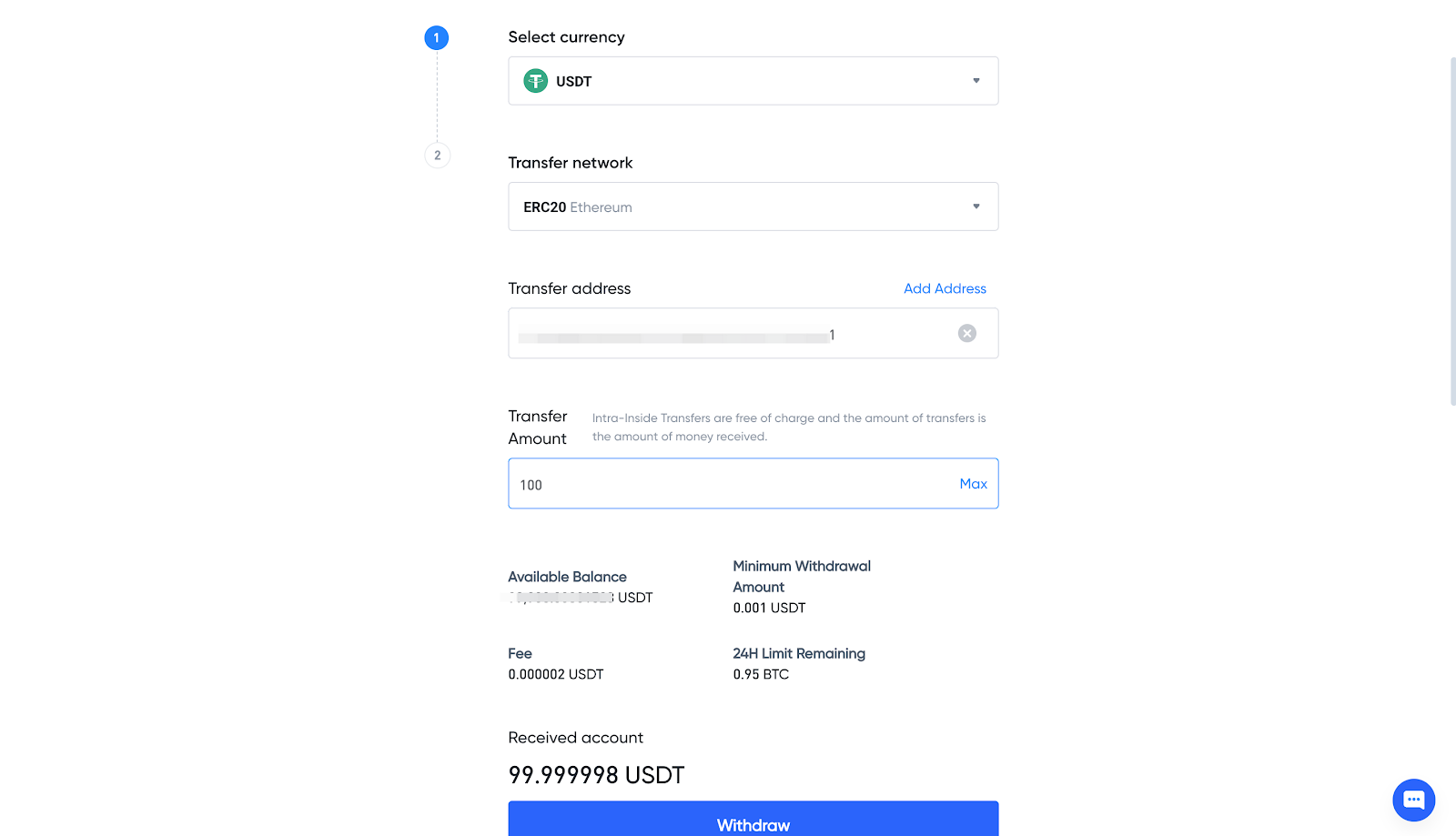 3. مبلغ و آدرس کیف پولی که میخواهید به آن USDT منتقل شود را وارد کنید. پس از آن روی گزینه «برداشت» کلیک کنید.