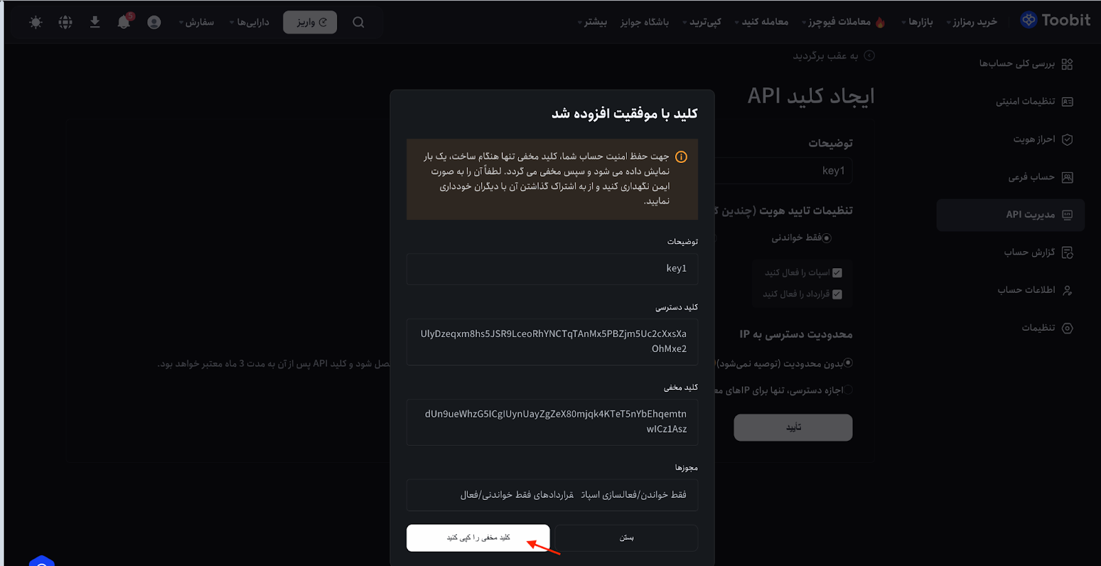 پس از انجام مراحل بالا، کلید API شما با موفقیت ایجاد میشود. کلید مخفی ایجاد شده را کپی کرده و در محلی امن نگهداری کنید.
