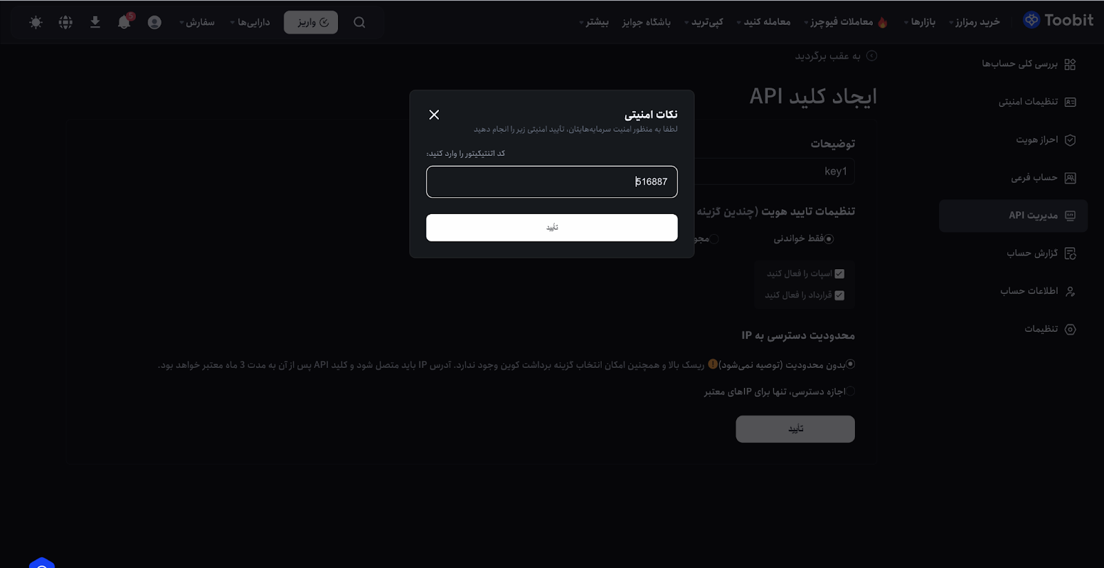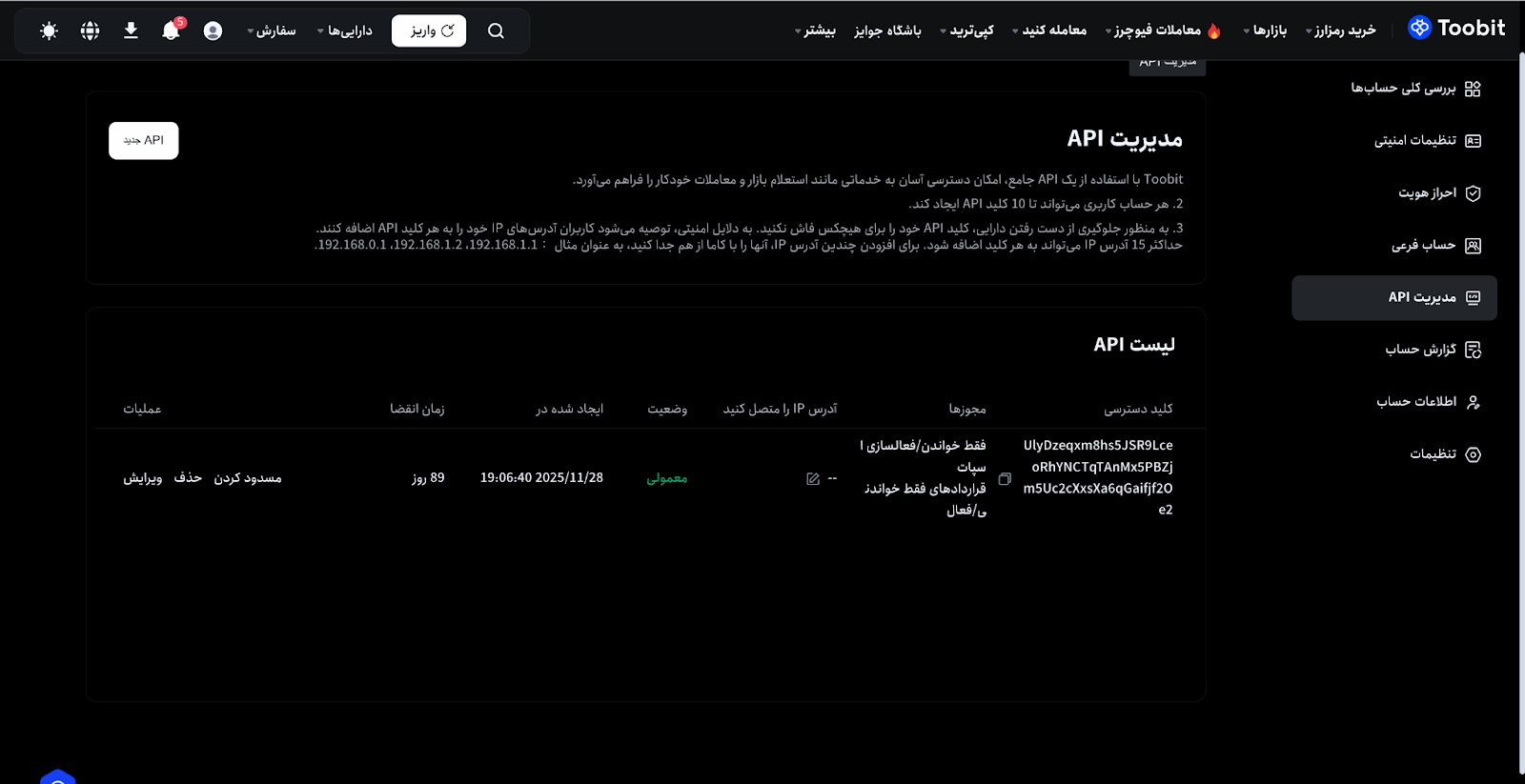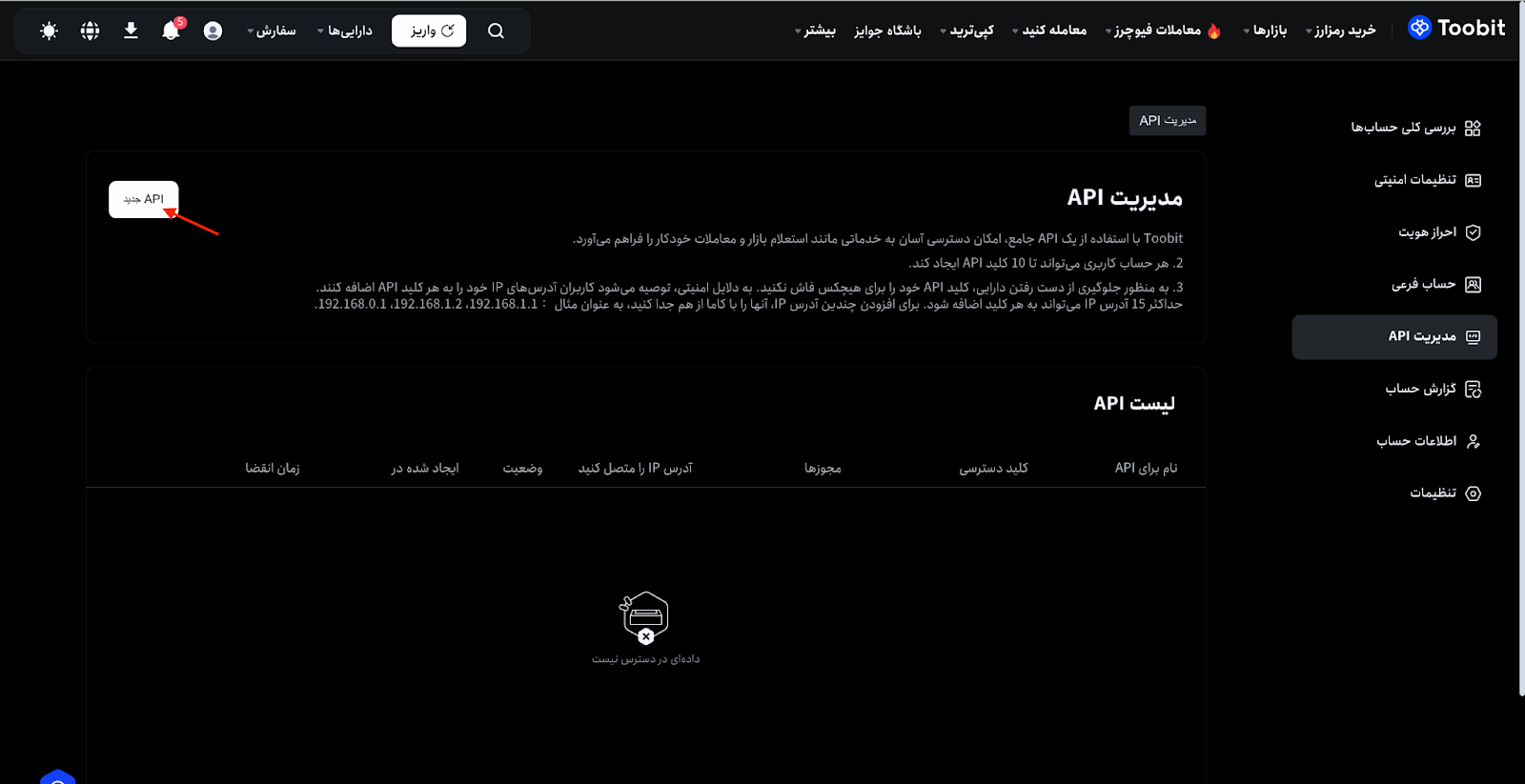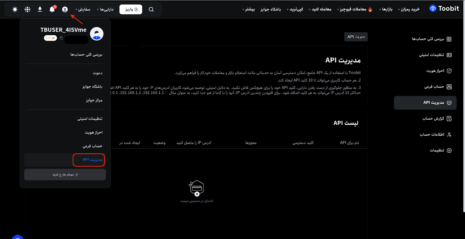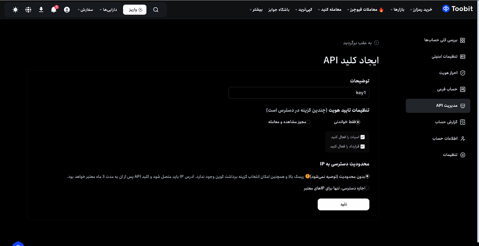 — ایجاد کلید API فقط از طریق نسخه وب/ کامپیوتر(PC) پلتفرم Toobit امکانپذیر است و در اپلیکیشن موبایل Toobit پشتیبانی نمیشود.