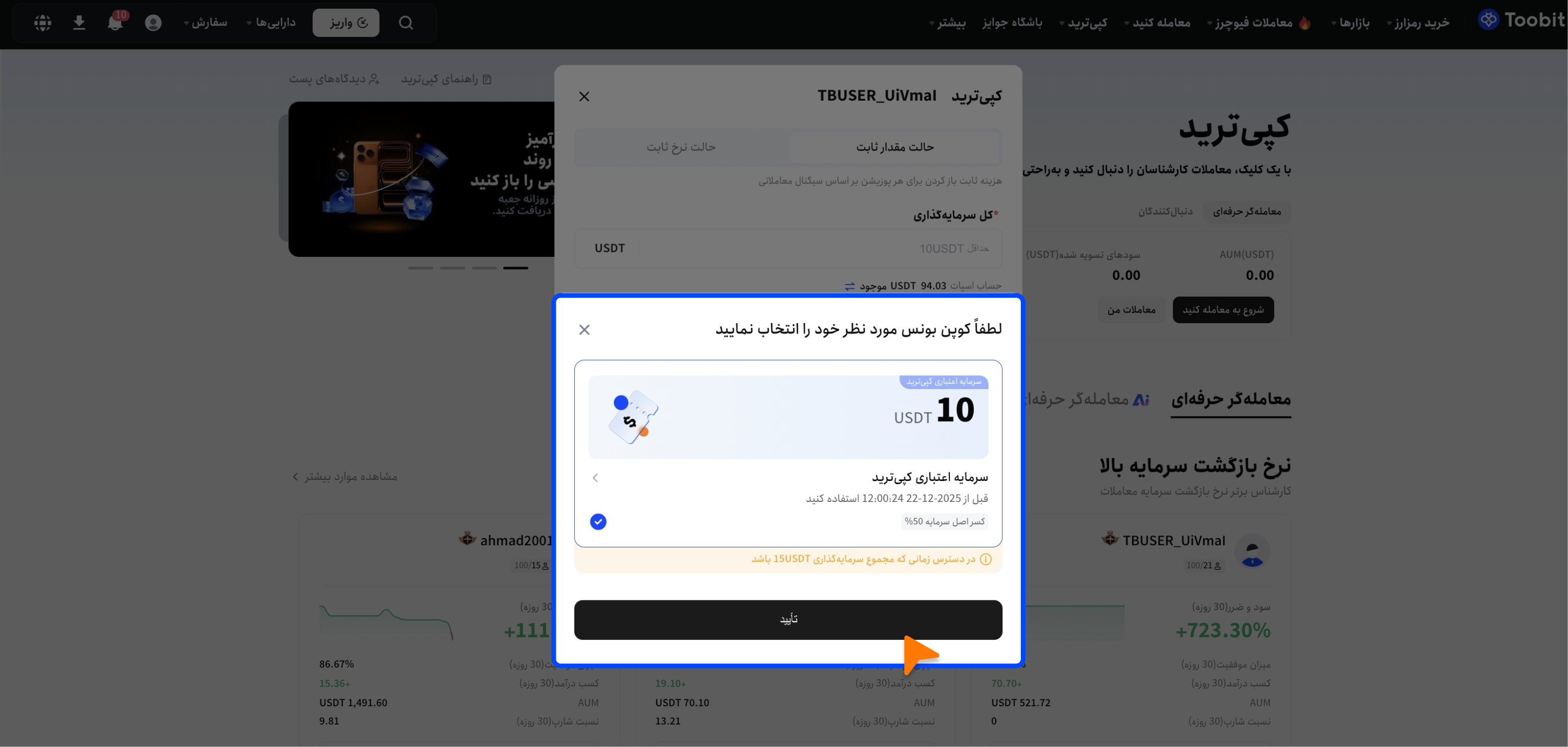 پلتفرم Toobit سرمایههای اعتباری کپیترید را برای کاربران ارائه میدهد. این سرمایهها با هدف فراهم کردن امکان تجربهی واقعی کپیترید در محیطی بدون ریسک طراحی شدهاند.