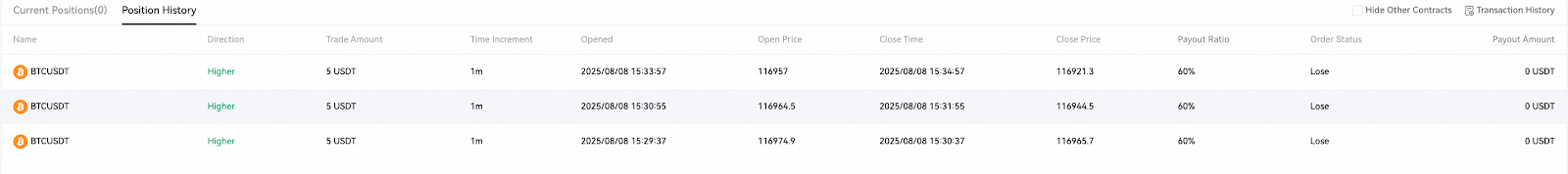 قراردادهای زماندار با USDT تسویه میشوند. در زمان انقضا، سیستم بهطور خودکار براساس قیمت شاخص تعیین میکند که آیا پیشبینی شما صحیح بوده است یا خیر: