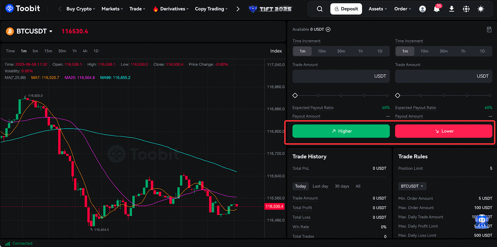 Toobit پیشنهاد میکند در چارچوب مسئولانه معامله کنید. هرگز با سرمایهای که توانایی از دست دادن آن را ندارید، معامله نکنید.