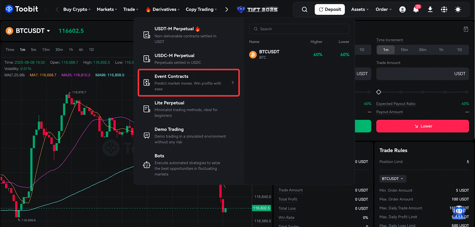 به حساب کاربری خود در وبسایت Toobit وارد شوید و به بخش *مشتقات* بروید. سپس دارایی مورد نظر خود را برای معامله انتخاب کنید.