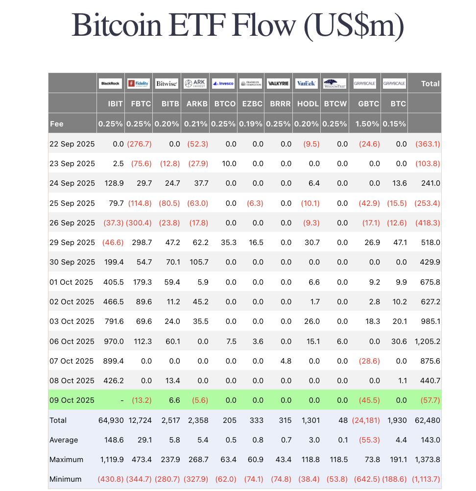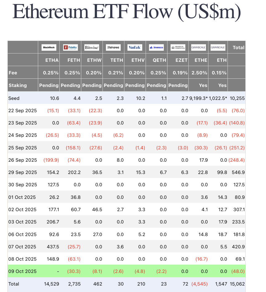 Pada 9 Oktober, tidak termasuk data BlackRock, ETF Bitcoin mencatat arus keluar sebesar $57,7 juta sementara ETF Ethereum mengalami arus keluar sebesar $48 juta.