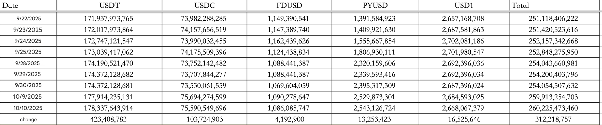 Stablecoin mengalami arus masuk bersih sebesar $312,22 juta pada 10 Oktober, dipimpin oleh arus masuk $423,41 juta ke USDT dan diimbangi oleh arus keluar $103,72 juta dari USDC. Total pasokan stablecoin sekarang mencapai $260,23 miliar.