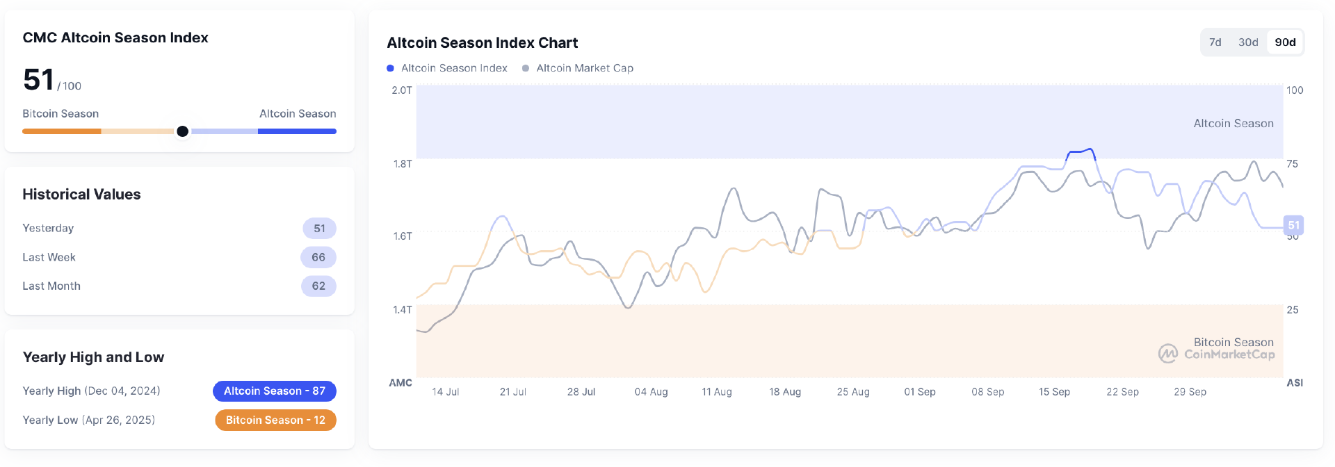 Pangsa pasar Bitcoin naik 0,57% menjadi 59,30% saat token utama tetap menjadi pusat perhatian. Indeks Altcoin berada di 51, menunjukkan cakupan yang lebih sempit di bawah para pemimpin.