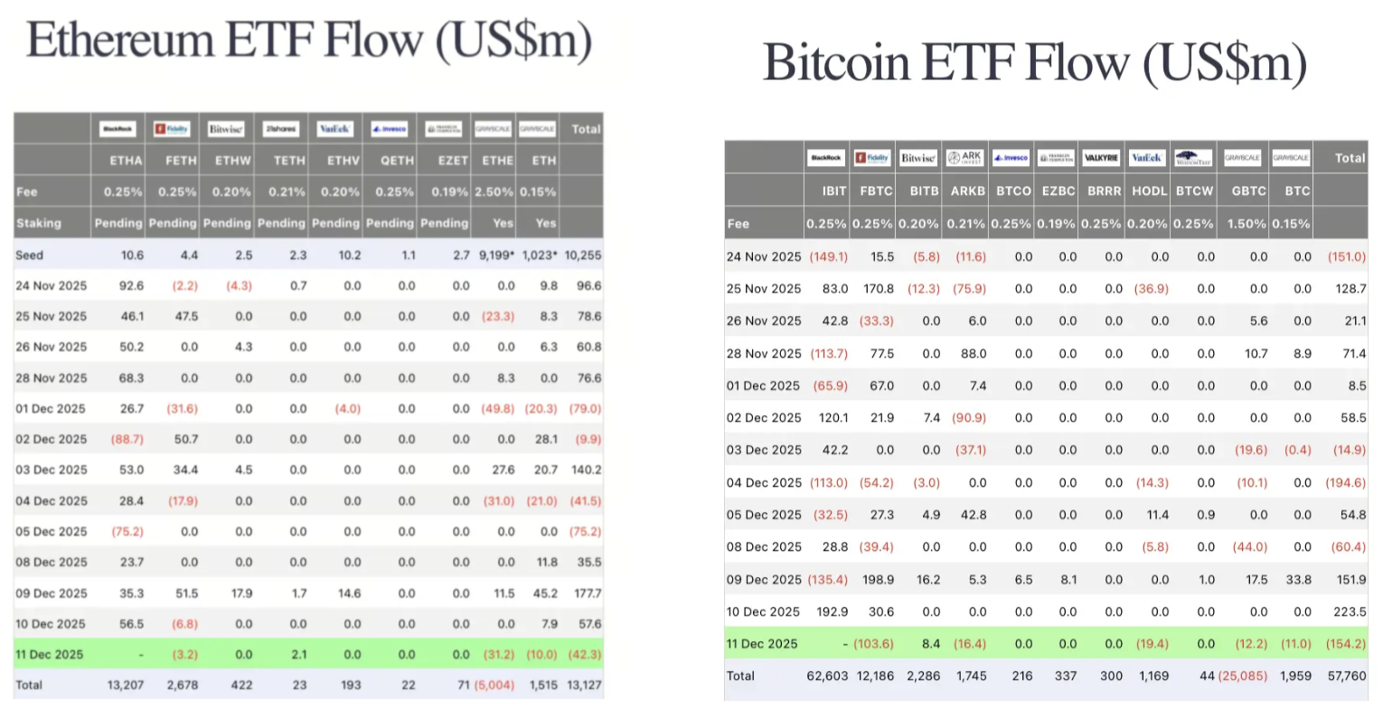 Partisipasi ETF melemah lagi. Pada 11 Desember, mengesampingkan data dari salah satu penerbit terbesar, ETF ETH mencatat aliran keluar sebesar $42,3M dan demikian pula, ETF BTC melihat aliran keluar sebesar $154,2M.