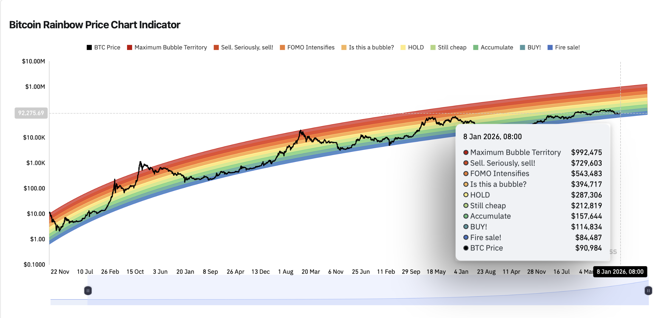 Di sinilah grafik pelangi BTC menjadi berguna. Ini memplot harga BTC pada skala logaritmik dan menampilkan "pita sentimen" berwarna di sekitar kurva tren jangka panjang, yang dimaksudkan untuk meratakan kebisingan sehari-hari dan menyoroti di mana BTC berada dalam siklus yang lebih luas.