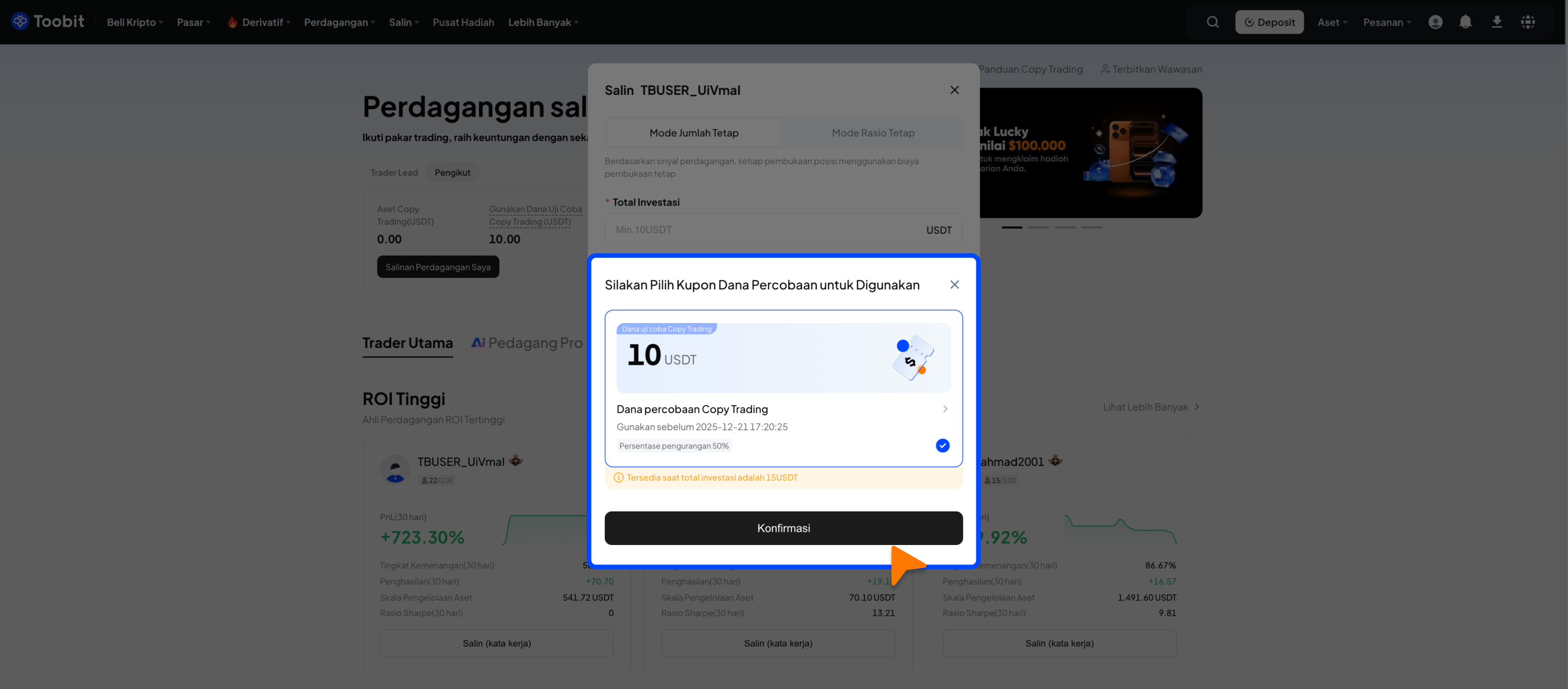 Skenario penggunaan: Hanya untuk copy trading. Dana percobaan tidak dapat ditransfer atau ditarik, maupun digunakan dalam jenis trading lainnya.