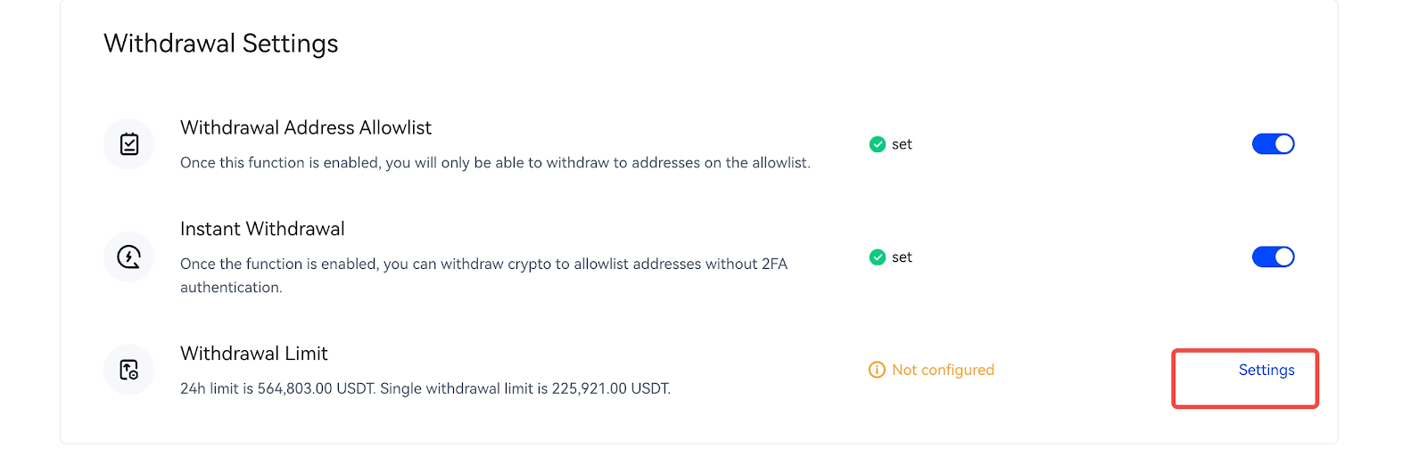 1. Masuk ke akun Anda. Buka [Aset] - [Pengaturan Keamanan] - [Pengaturan Produksi], lalu temukan [Batas Penarikan] dan klik [Pengaturan].