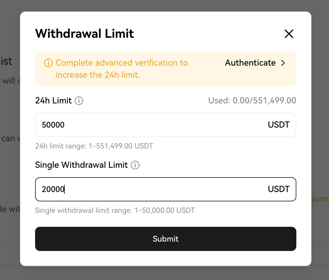 Setelah menyelesaikan Verifikasi Lanjutan, batas 24 jam meningkat menjadi 50 BTC.
