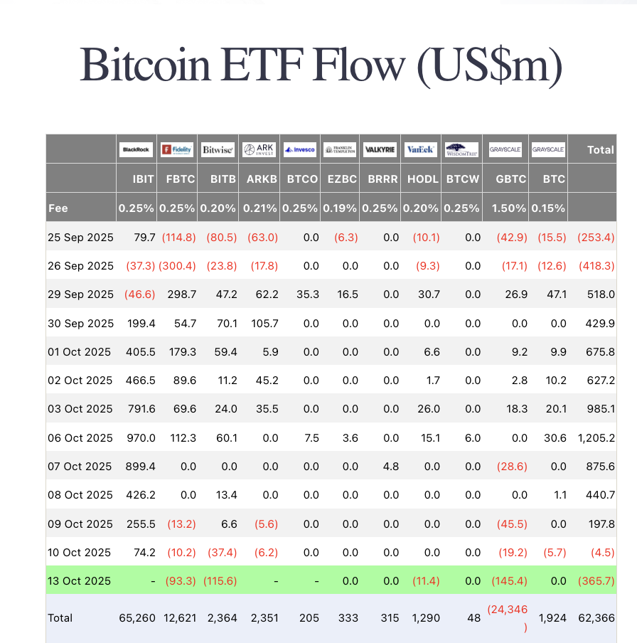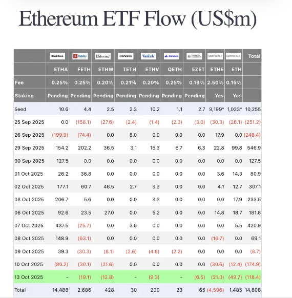 ETFの活動はリスクオフのままでした。10月13日、ブラックロックのデータを除くと、BTC ETFは$365.7Mの流出を見せ、ETH ETFは$118.41Mを失いました。これは、規制プロセスが停滞している中での機関投資家の慎重さを示すもう一つの兆候です。