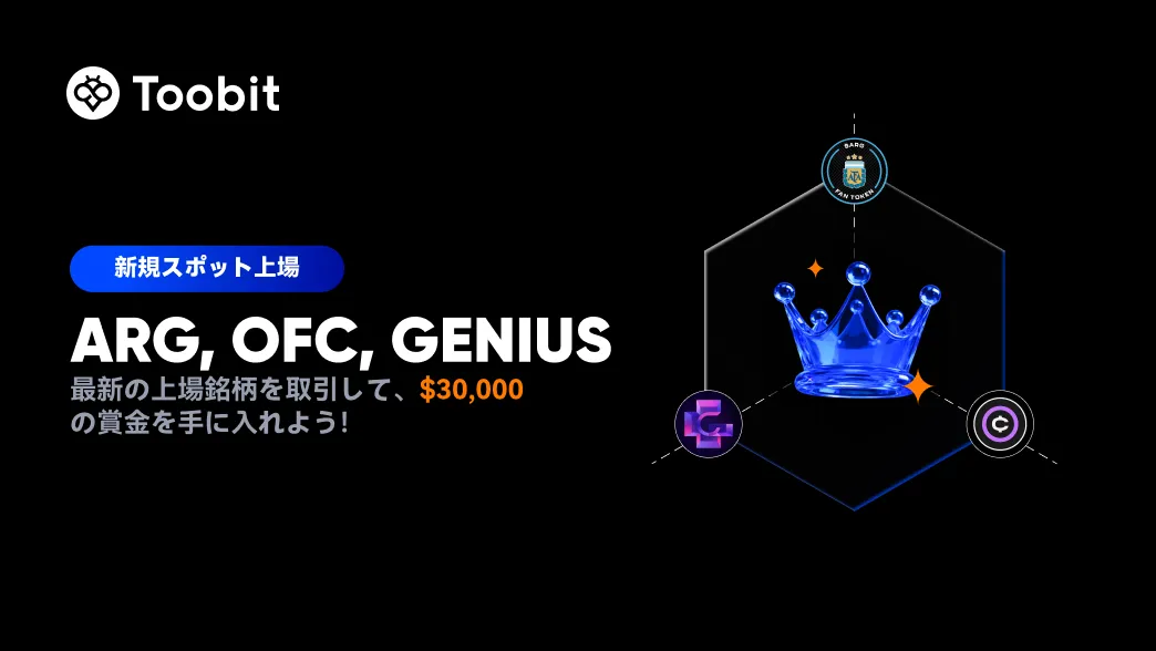 ARG、OFC、GENIUSが正式にToobitに上場し、大々的にお祝いしています。私たちの限定トレーディングキャンペーンに参加して、10,000 USDTのボーナスと20,000ドルのトークンエアドロップを含む30,000ドルの賞金プールを手に入れましょう。