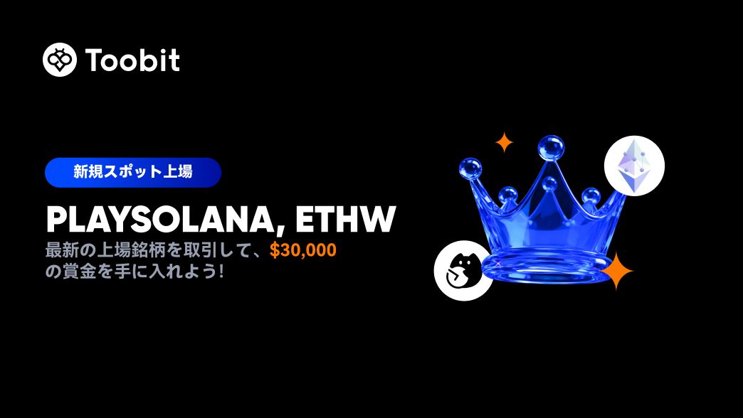 PLAYSOLANA、ETHWが正式にToobitに上場し、大々的にお祝いしています。私たちの限定トレーディングキャンペーンに参加して、10,000 USDTのボーナスと20,000ドルのトークンエアドロップを含む30,000ドルの賞金プールを手に入れましょう。