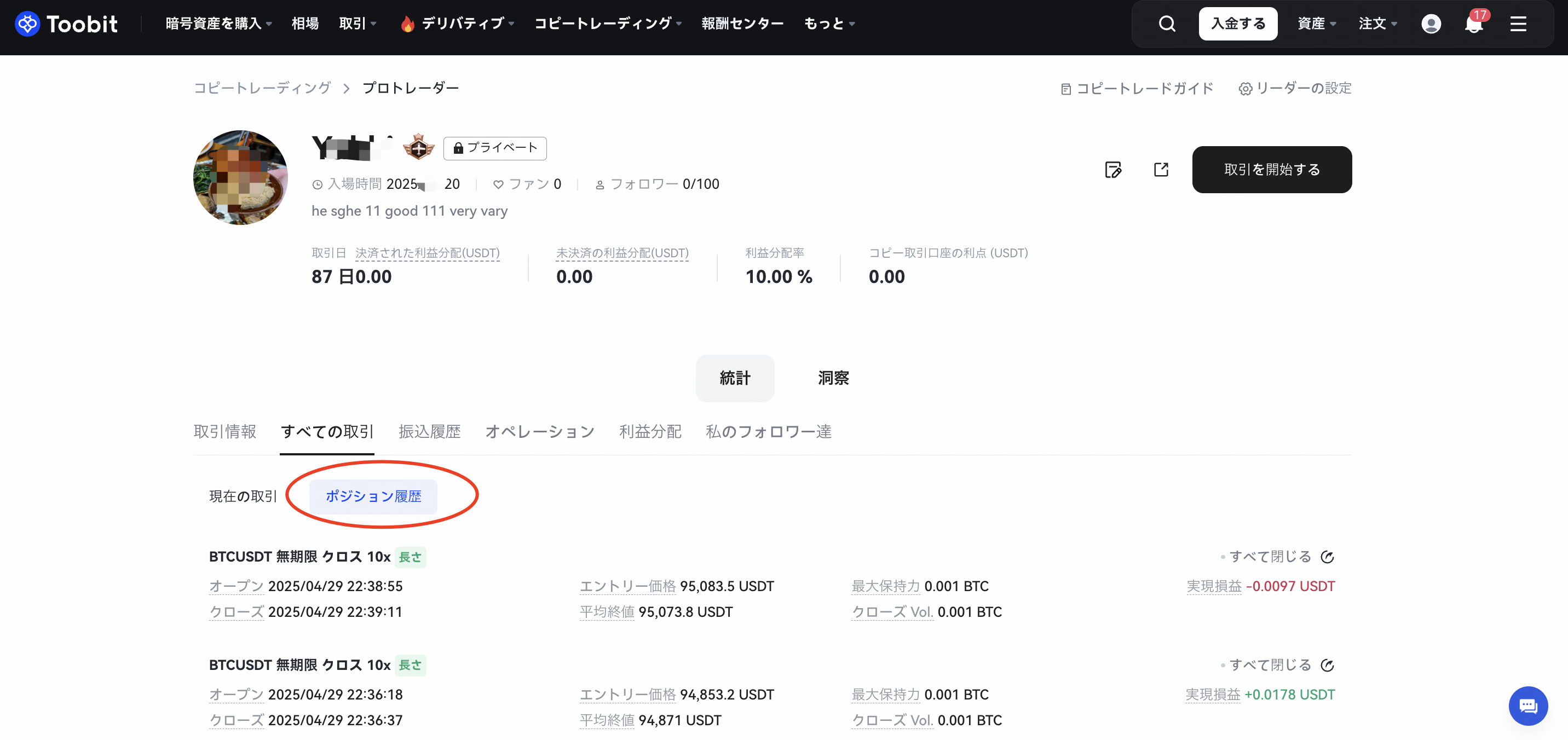 Pro Traderのホームページで、すべての取引の下にあるポジション履歴をクリックして、コピー取引のポジション履歴を確認します。