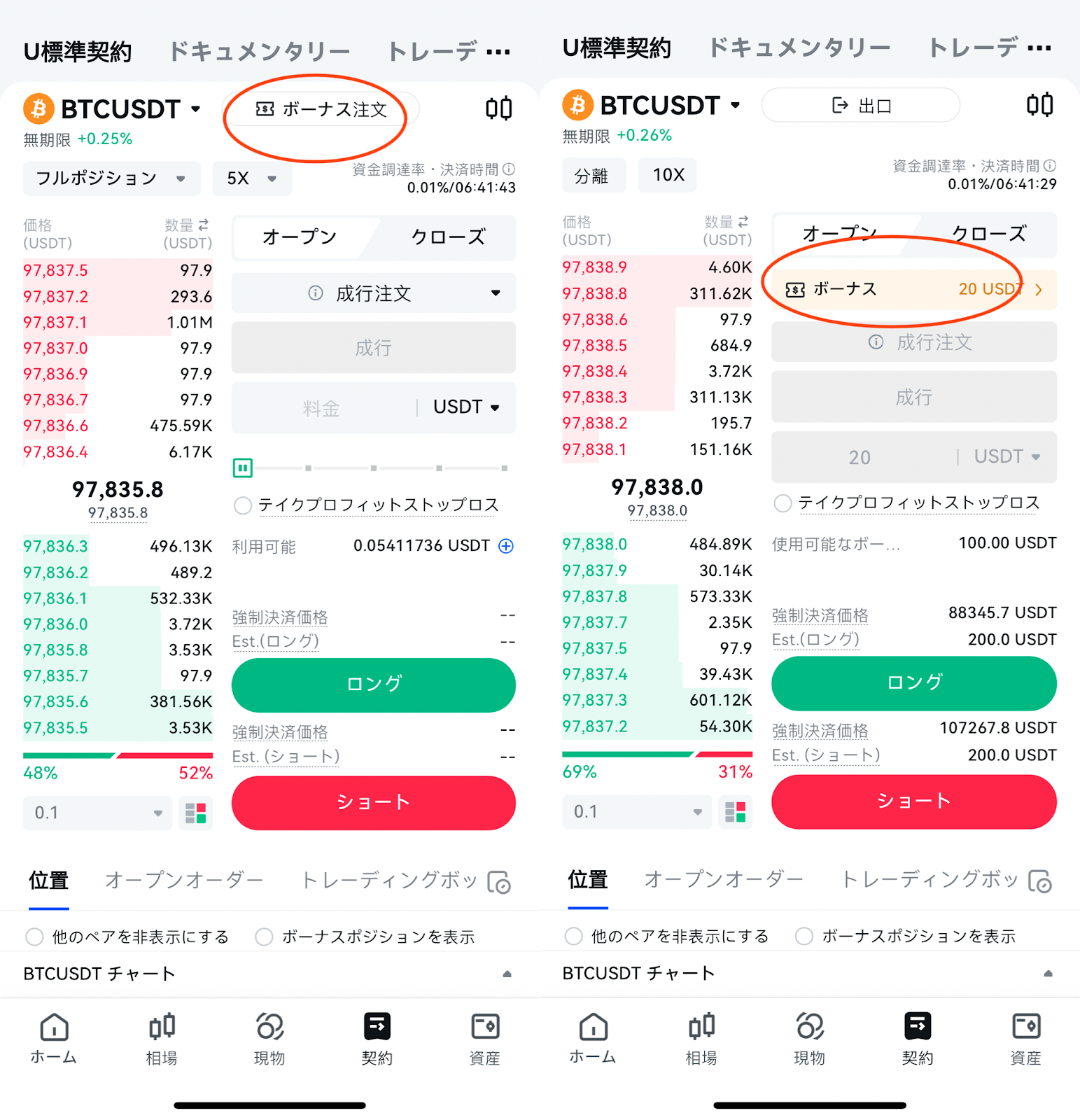 2. または、先物取引ページで右上の「ボーナスを使用」ボタンをタップし、「先物ボーナス」を選択することもできます。