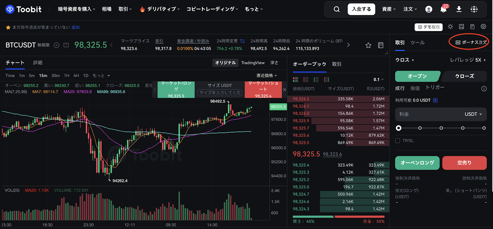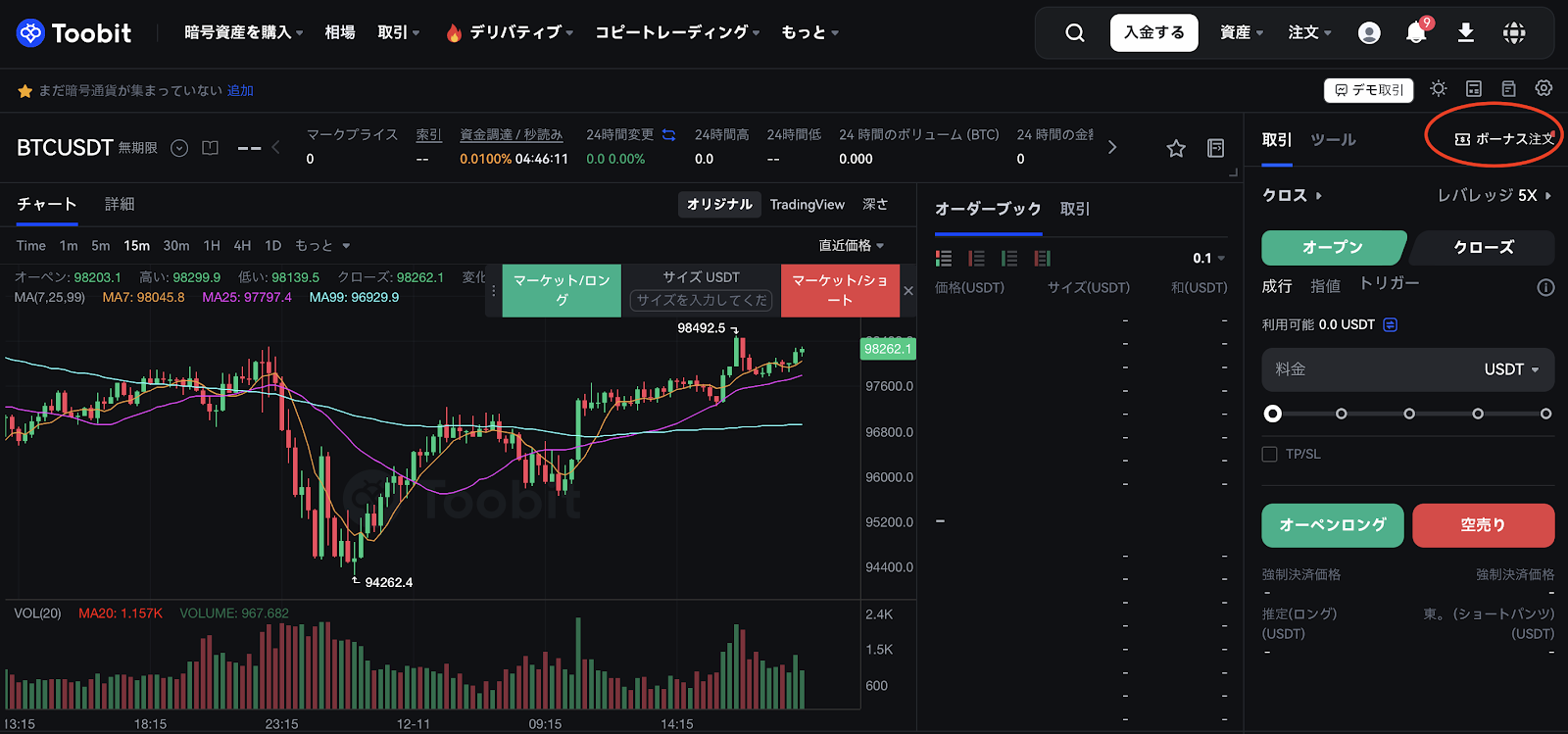 2. また、先物取引ページでは、右上隅にある「Use Bonus」アイコンをクリックすることで、利用可能なFutures Bonusをご確認いただけます。