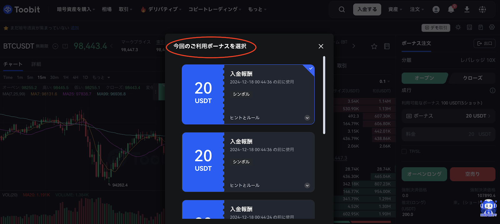 1. 先物取引ページに移動した後、右上隅の「ボーナスを使用」ボタンをクリックし、使用する利用可能なボーナス券を選択します。