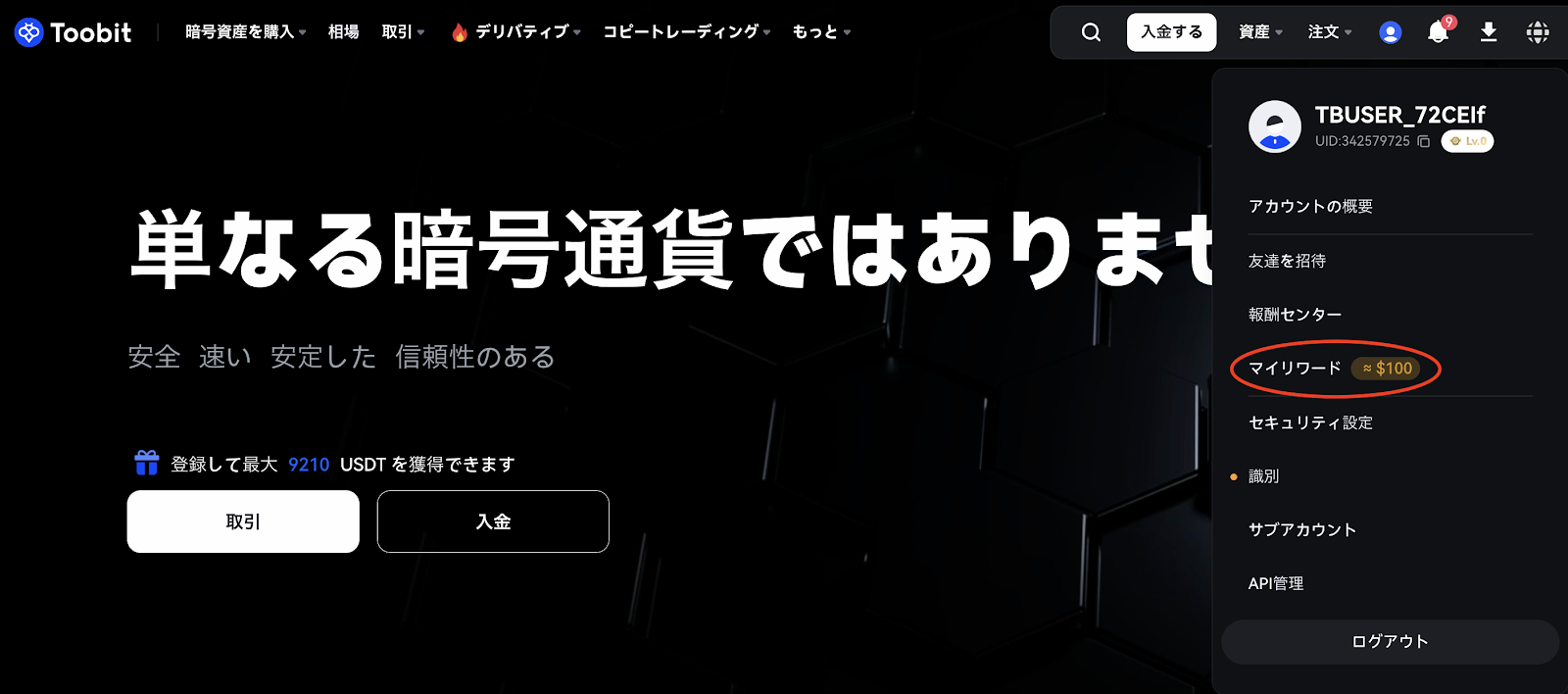 1. ToobitのホームページからToobitアカウントにログインします。ページ右上のプロフィールをクリックし、ドロップダウンメニューから「My Rewards」を選択して、利用可能なFutures Bonusをご確認ください。