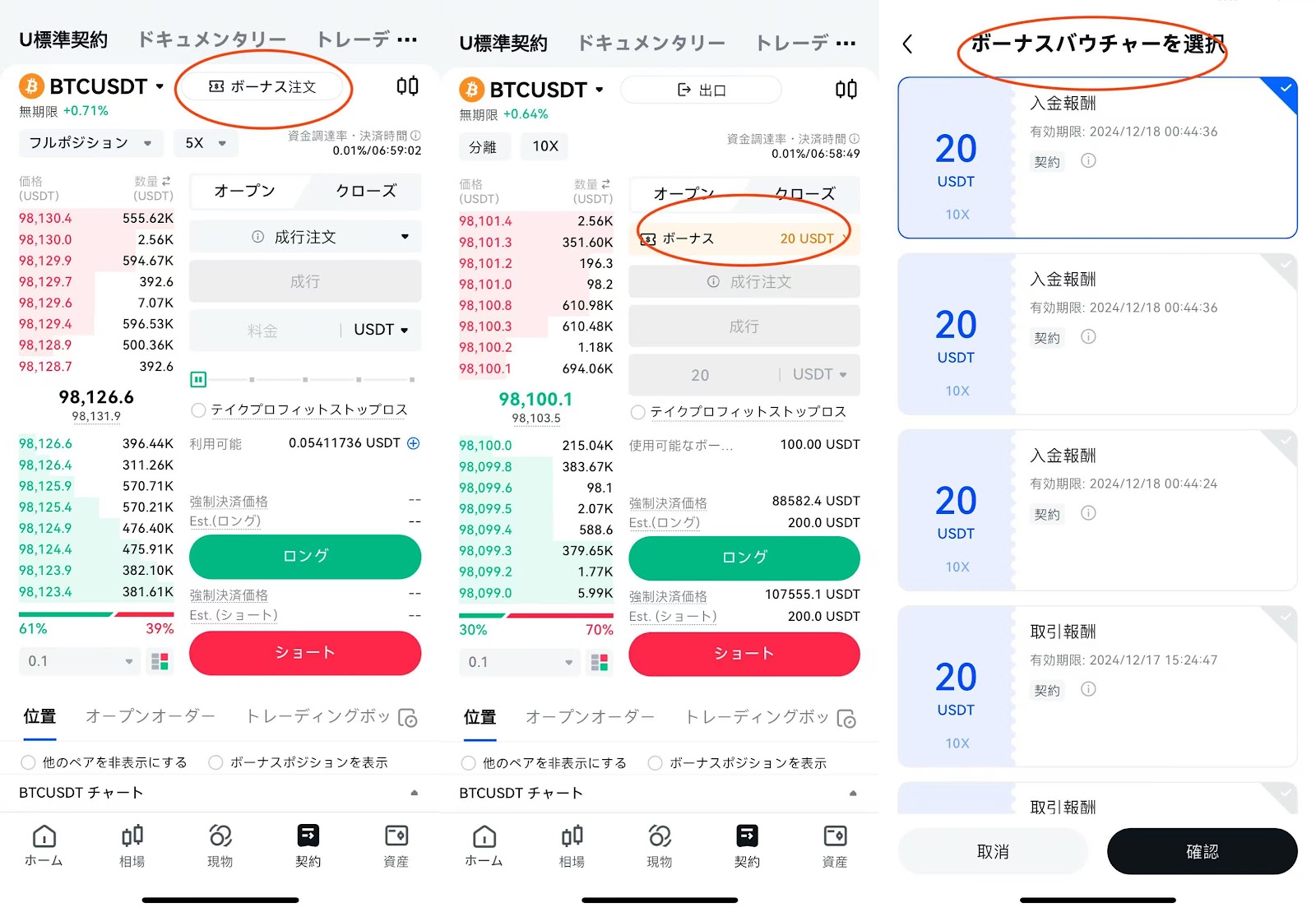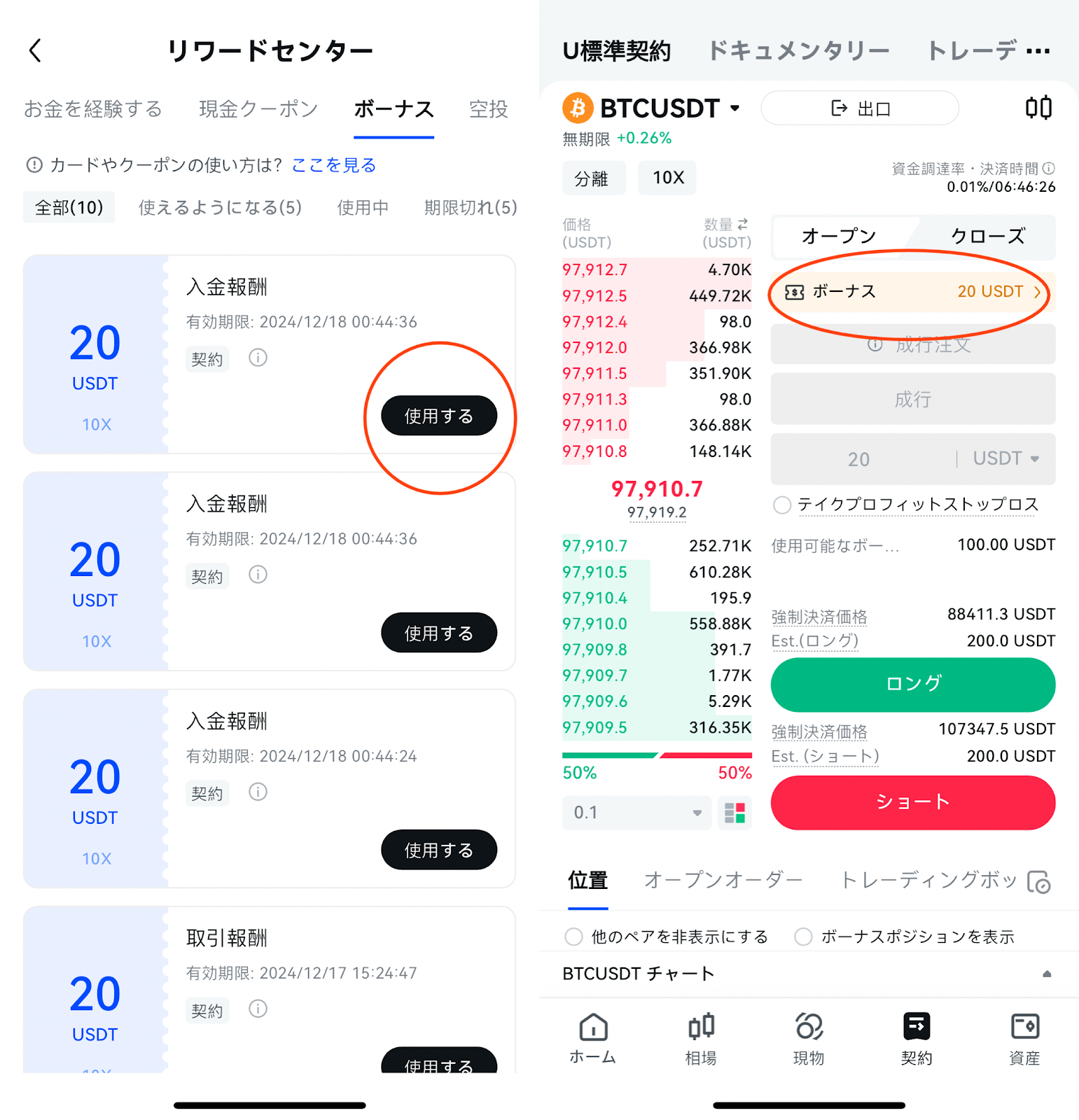 2. 次に、アプリ内の先物取引ページに移動します。アプリの右上にある「ボーナスを使用」をタップし、Futures Bonusのルールに従ってボーナス券を選択し、ポジションを開きます。