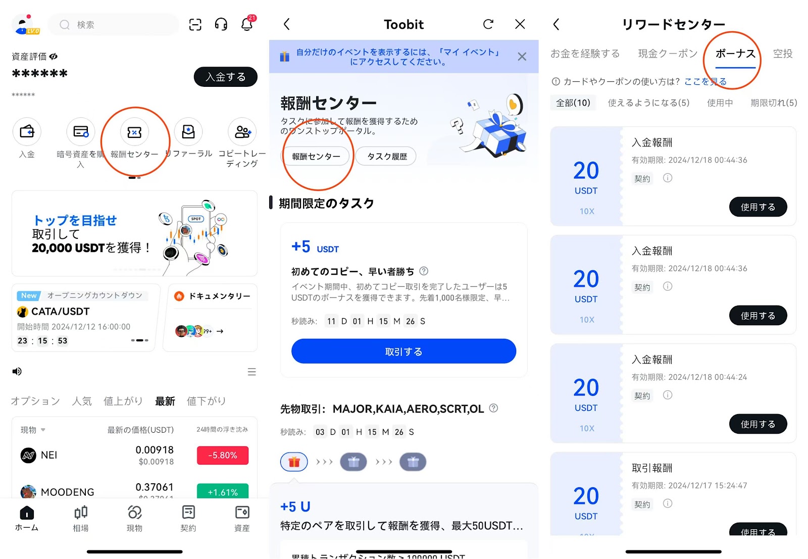 1. Toobitアプリを起動し、「福利センター」に移動します。その後、「クーポンセンター」を選択し、「ボーナス」をタップして利用可能な先物ボーナスをすべて確認してください。