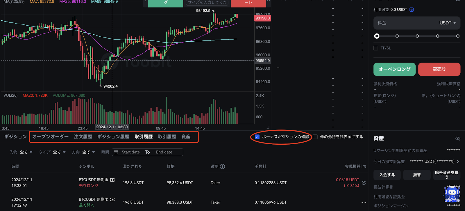3. ポジションをクローズした後、ボーナス取引の詳細を確認するには、「ボーナス注文のみ」をフィルタリングして、選択した先物ボーナスに関連するポジション、オープン注文、注文履歴、ポジション履歴、取引履歴を表示できます。