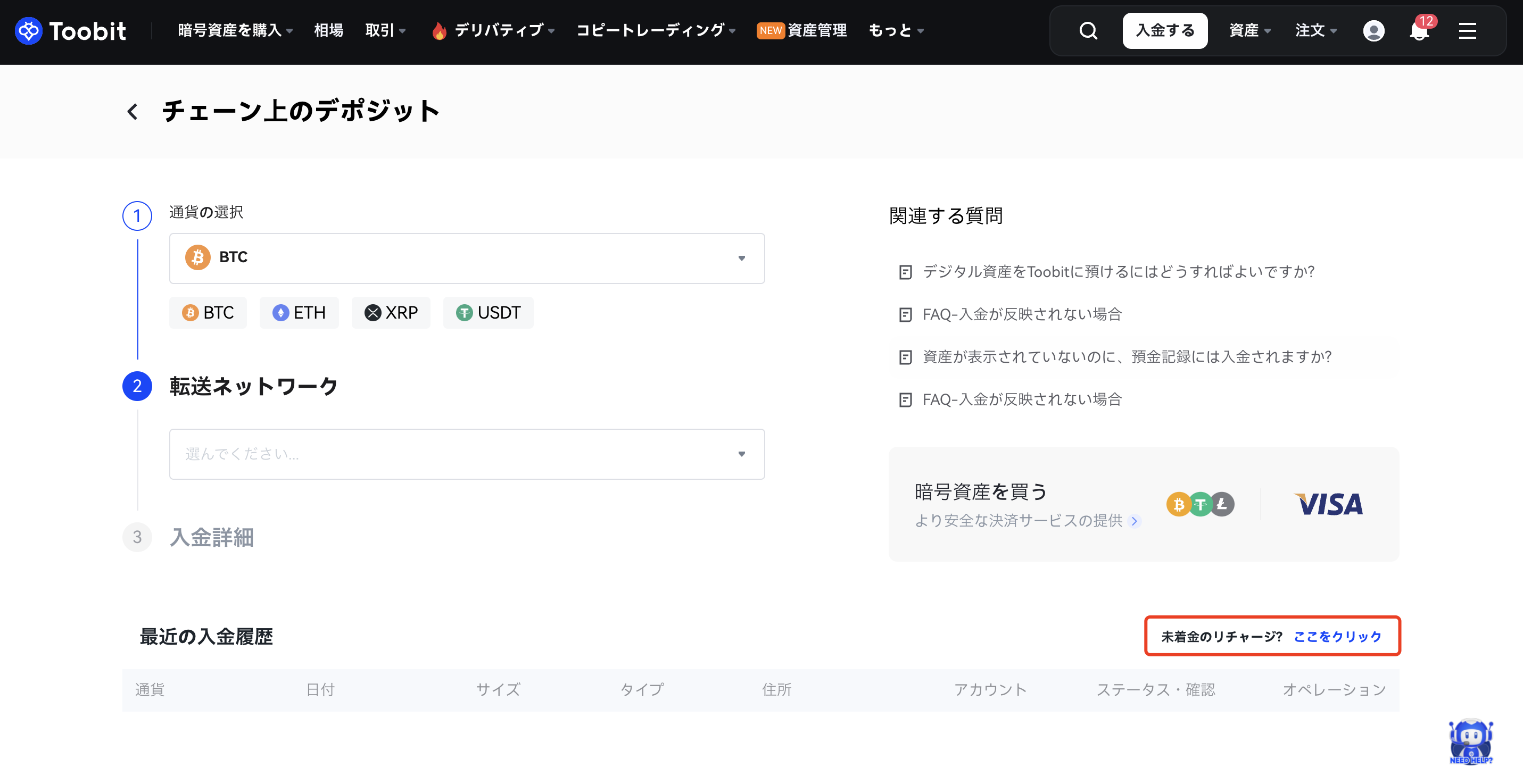 Toobit入金プラットフォームを訪問し、未反映入金をクリックしてください。 ページ右下にこちらをクリックしてください。