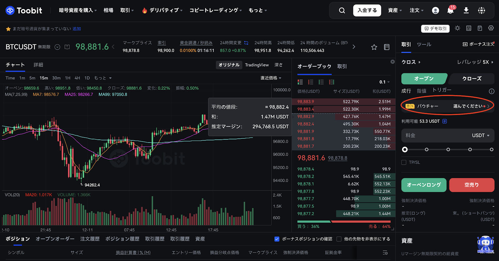 - パーペチュアル契約取引ページに移動し、左側の「ポジションを開く」をクリックして、利用可能な体験金を選択してください。
