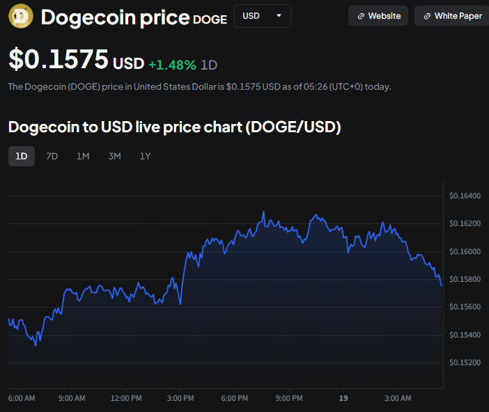 De DOGE-prijsdiagrammen weerspiegelen een scherpe correctie die overeenkomt met de bredere marktneergang. Op het moment van schrijven handelt de DOGE-prijs rond $0,15.