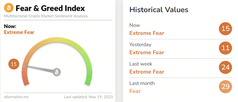 Het marktsentiment is sterk gedaald, met de Fear & Greed Index die daalt naar 10–16, stevig in het "Extreme Fear"-gebied. Dit is de laagste meting sinds de COVID-19-schok in maart 2020.