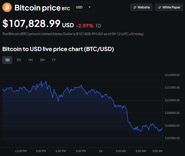 De Bitcoin-prijs dook onder de $105.000 voordat hij herstelde boven de $114.000. Op het moment van schrijven handelt de BTC-prijs iets boven de $107.000.