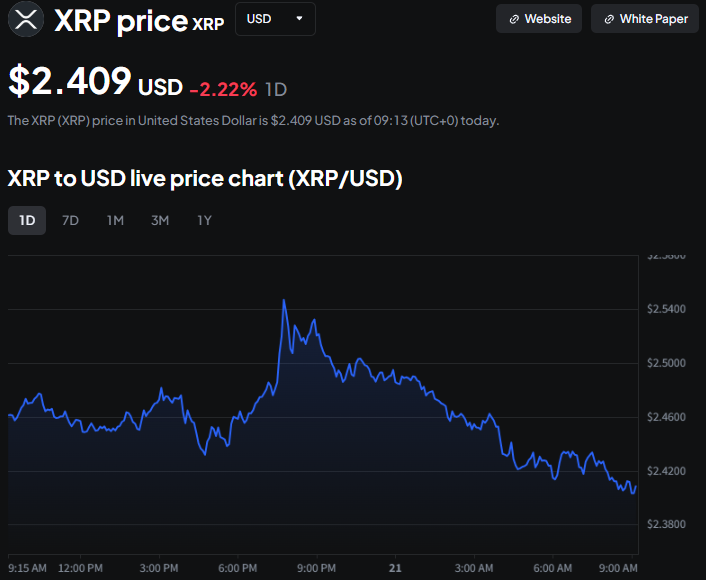 Ondertussen werkt XRP zich stilletjes omhoog. De crash sloeg ook toe; de prijs van XRP daalde en de XRP-prijsdiagrammen tonen een betekenisvolle correctie. De XRP-prijs handelt rond de $2,40 op het moment van schrijven.