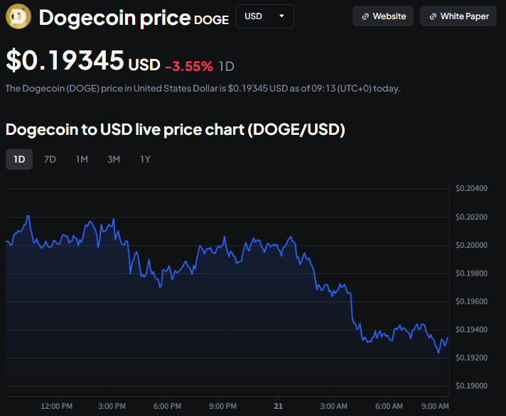 Sinds de duik heeft DOGE enig herstel getoond, maar het voelt meer als een opleving dan een verschuiving in het verhaal. Op het moment van schrijven handelt de Dogecoin-prijs rond de $0,19.