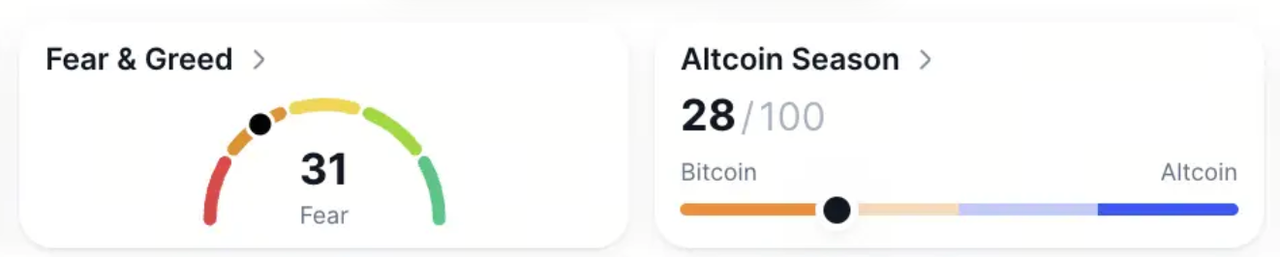 De Fear & Greed Index daalde naar 31, met de altcoin index op 28, wat de aanhoudende onrust onder investeerders onderstreept.