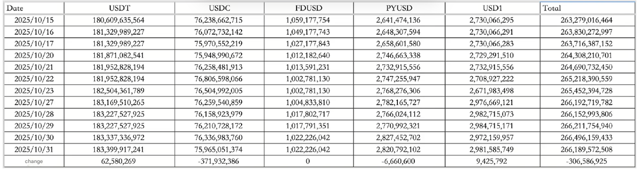 Stablecoin stromen zagen een netto uitstroom van $306,59M op 31 oktober, aangezien USDT $62,58M aan instromen registreerde gecompenseerd door $371,93M aan USDC aflossingen, waardoor de totale circulerende voorraad rond de $266,19B bleef.