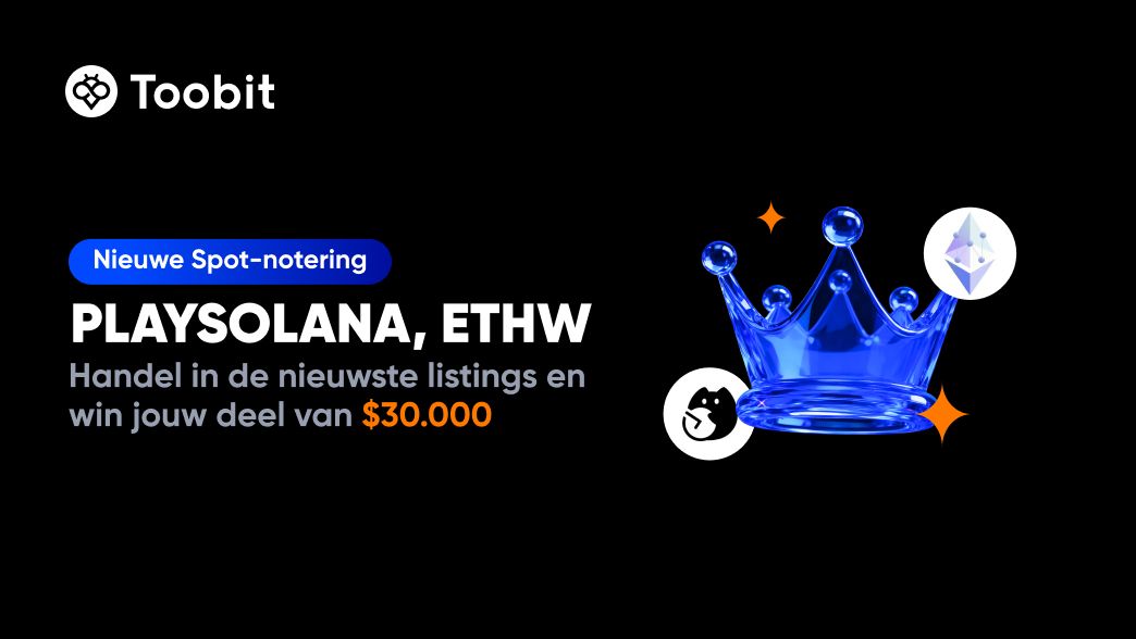 PLAYSOLANA, ETHW zijn officieel geland op Toobit, en we vieren dit groots. Doe mee aan onze exclusieve handelscampagne en claim jouw deel van de $30.000 prijzenpot, inclusief 10.000 USDT in bonussen en $20.000 in token airdrops.