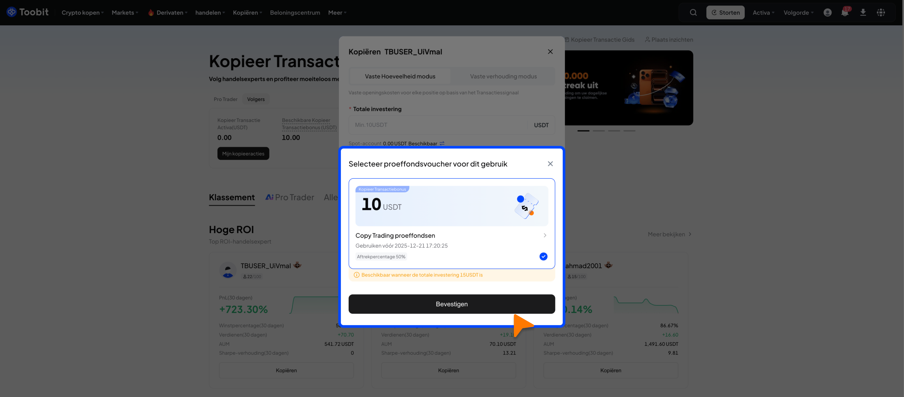 Onder [Mijn traders] kun je de status controleren van de traders die je volgt met je proeffonds. Je kunt ook vouchergebruik bekijken onder [Totale investering].