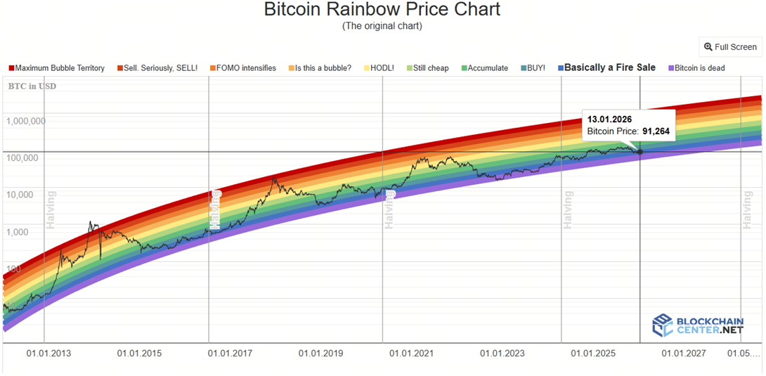 Tęczowy wykres BTC pokazuje, że Bitcoin znajduje się w środkowych pasmach wyceny na połowę stycznia 2026 roku, nie w strefie bańki i nie w kapitulacji. Przy około 91 000 USD, cena BTC znajduje się w zakresie „Praktycznie wyprzedaż”.