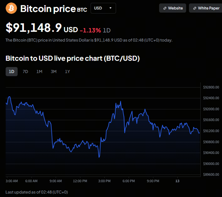 Cena BTC dzisiaj to mniej spekulacja, a bardziej pozycjonowanie. Bitcoin osiedlił się w swojej roli jako makro aktywo kryptowalutowe. W momencie pisania, cena BTC wynosi nieco ponad 91 000 USD.