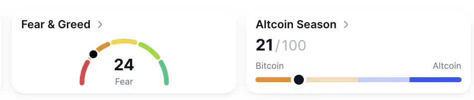 Nastroje rynkowe pozostały ostrożne, ponieważ Indeks Strachu i Chciwości utrzymał się na poziomie 24 z Indeksem Altcoinów na poziomie 21, co pokazuje, że apetyt na ryzyko ustabilizował się, ale nie poprawił się znacząco.
