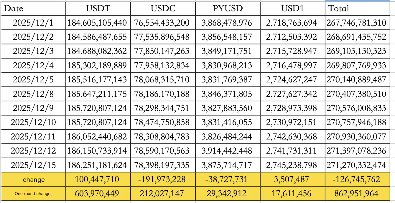 Przepływy stablecoinów wykazały netto odpływy w wysokości 126,75 mln USD 15 grudnia, napędzane przez napływ 100,45 mln USD do USDT i odpływ 191,97 mln USD z USDC.