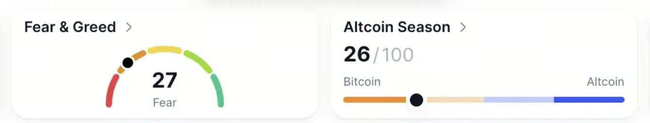 Rynek poruszał się szeroko, kontynuując swój korekcyjny rytm. Indeks Strachu i Chciwości spadł do 27, podczas gdy indeks Sezonu Altcoinów utrzymywał się na poziomie 26, odzwierciedlając utrzymującą się ostrożność. Analitycy zauważają, że jeśli sentyment spadnie poniżej 20, może to oznaczać krótkoterminową strefę dna dla kontrariańskich wejść.